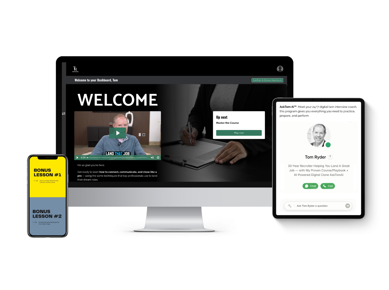 AskTom AI™ — Your 24 / 7 Digital Twin Coach AskTom AI™ is your built-in mentor and practice partner — a digital twin of Tom Ryder that guides you through every module and prepares you for real interviews.